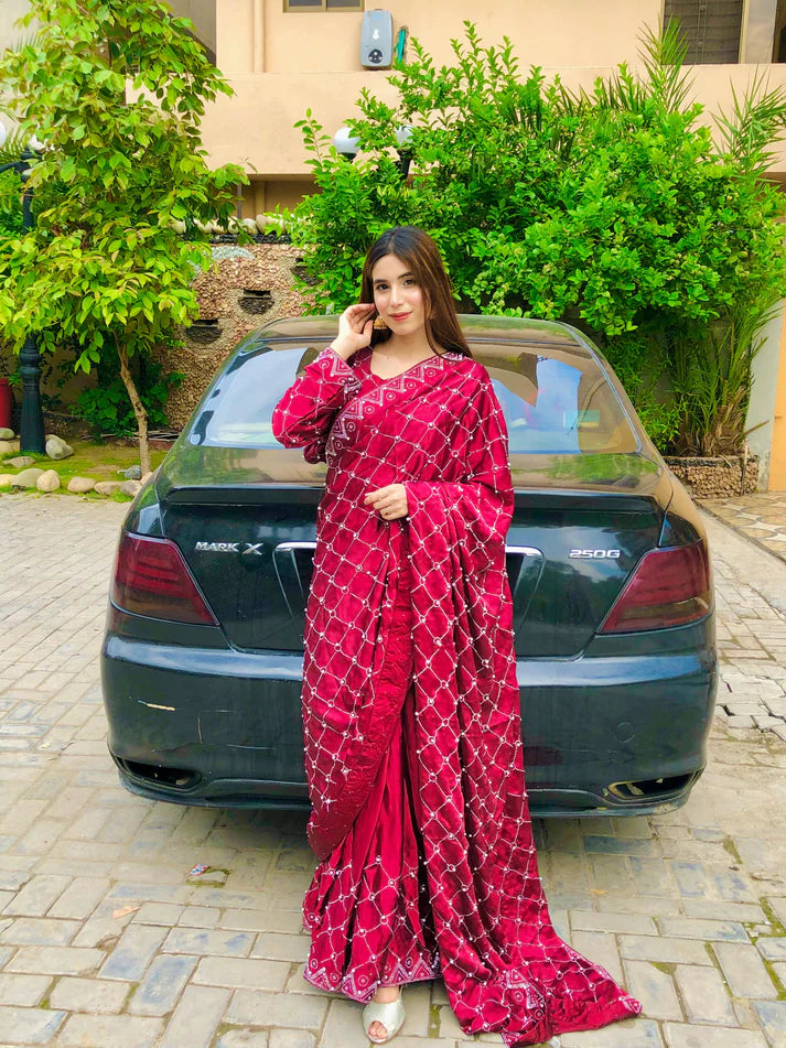 Shamoz Silk Saree with Pearl & Stone Work (stitched)